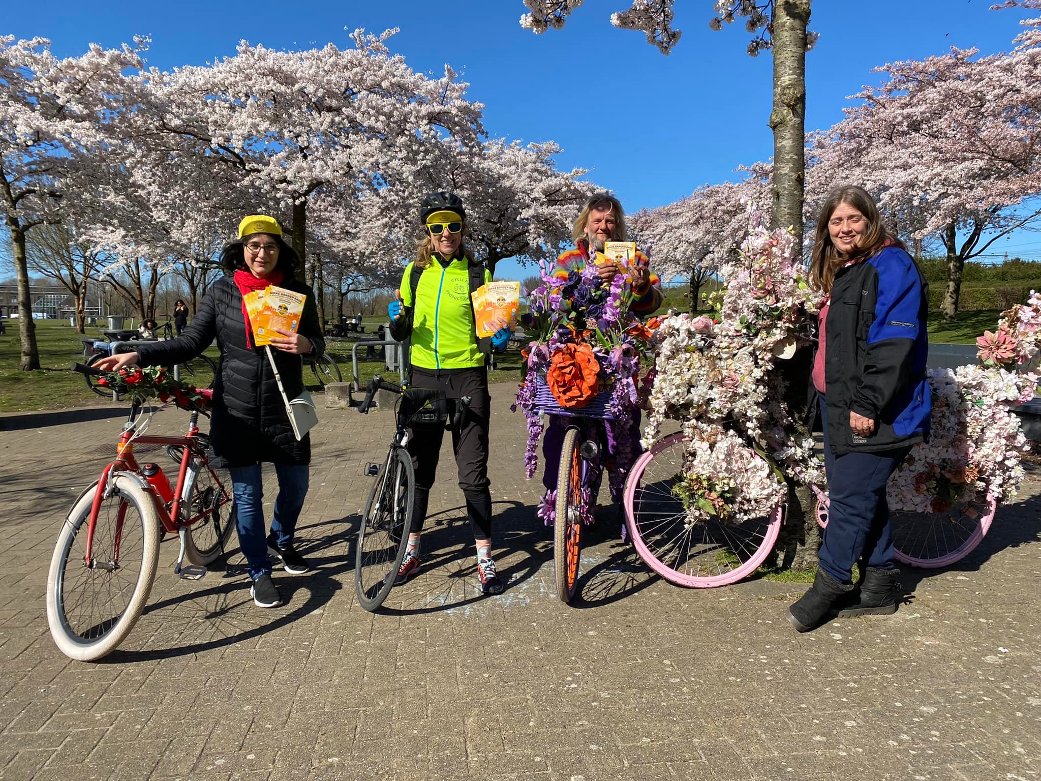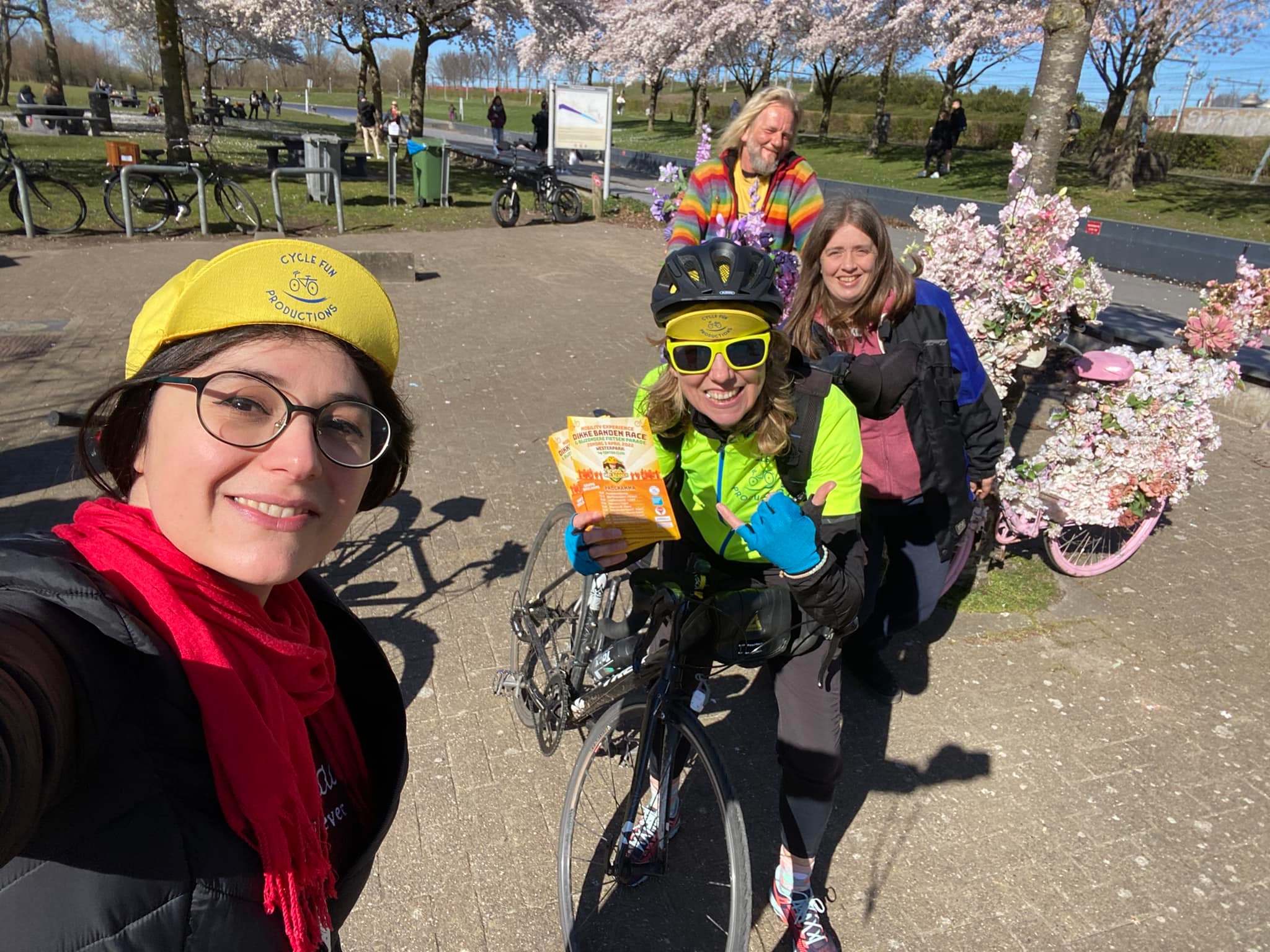 This Sunday, 3rd April 2022, you are invited to the Dikke Banden Race 2022, in Westerpark, Amsterdam. This annual race is dedicated to children, up to and including 12 years old. As Cherry Cruiser is one of the “all-time Marshal” volunteers, we assure you that the course is safe and well prepared with fences, barrier tape, banners, and flags. At the start and finish line, we have a jury and an MC that creates a competitive atmosphere for the race. Around the track are traffic marshals, cheering crowds, and fans. Here is our dream team last weekend in Westerpark: Paulien from Cycle Fun Production, Liliana aka Cherry Cruiser, Warren aka Flowerbikeman, and his lovely wife Michele.